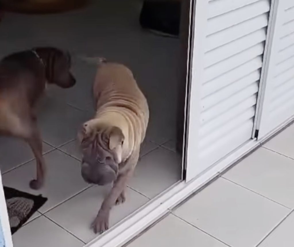 In her new home, Sofi adjusted quickly. Her two new moms made sure she had everything she needed—a soft bed, gentle walks, nutritious food, and, most importantly, endless affection. She also gained a new best friend: another Shar-Pei, full of playful energy. The two dogs became inseparable. They chased each other around the yard, shared toys, and napped side by side in sunny spots by the window. For a dog who once lived in darkness, Sofi had finally found her light.