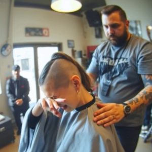 The low hum of the clippers filled the small barbershop, blending with the faint scent of shaving cream and aftershave. A young woman sat in the chair, her trembling hands clutching the armrests…